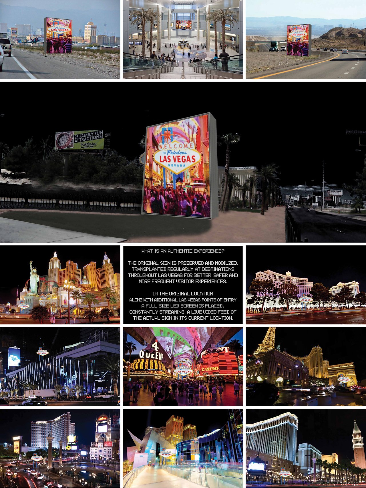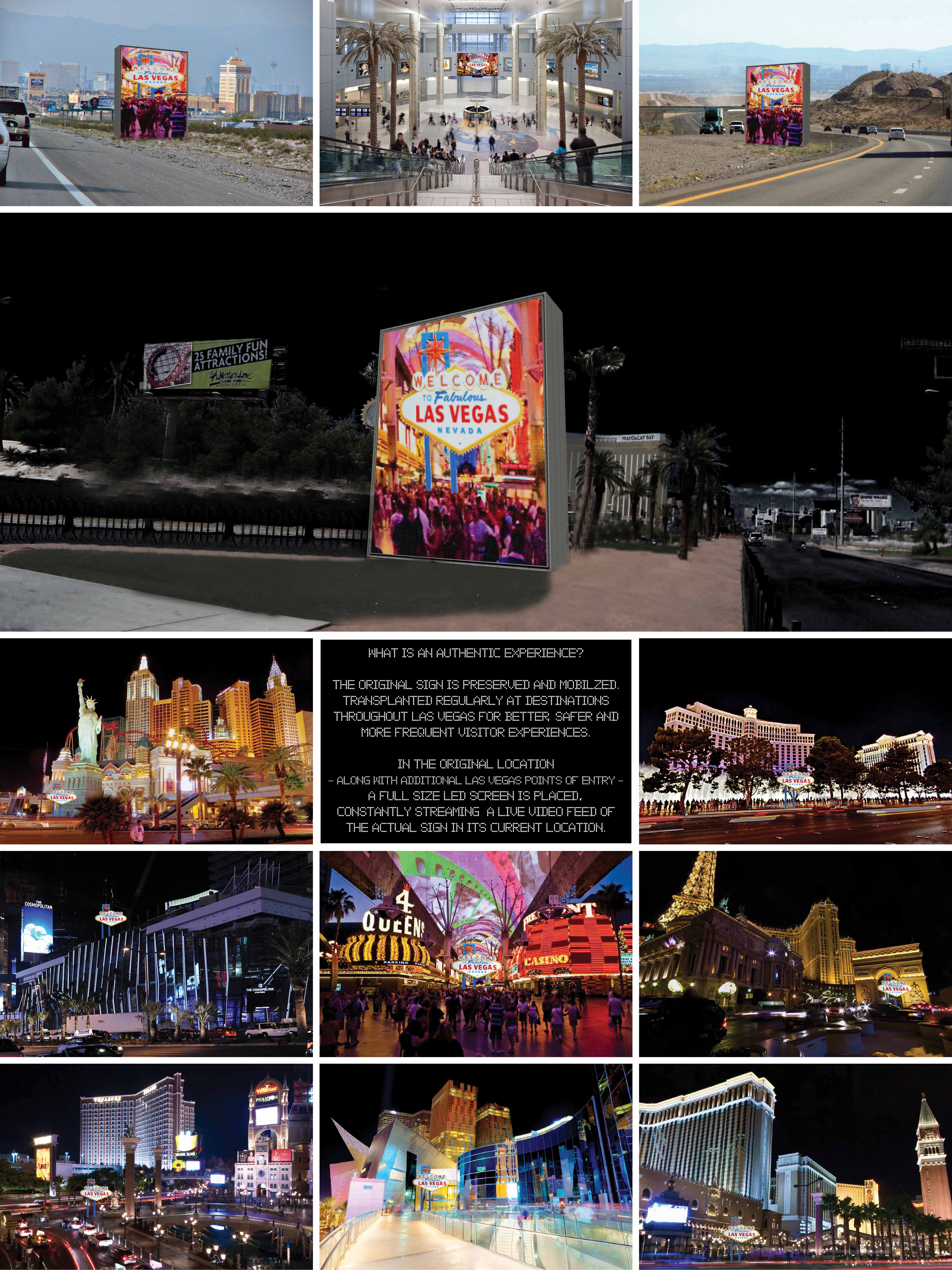 The original sign is preserved and mobilized, transplanted regularly at destinations throughout Las Vegas for better, safer and more frequent visitor experiences. In the original location (along with additional Las Vegas points of entry) a full size LED screen is placed, constantly streaming a live video feed of the actual sign in its current location.