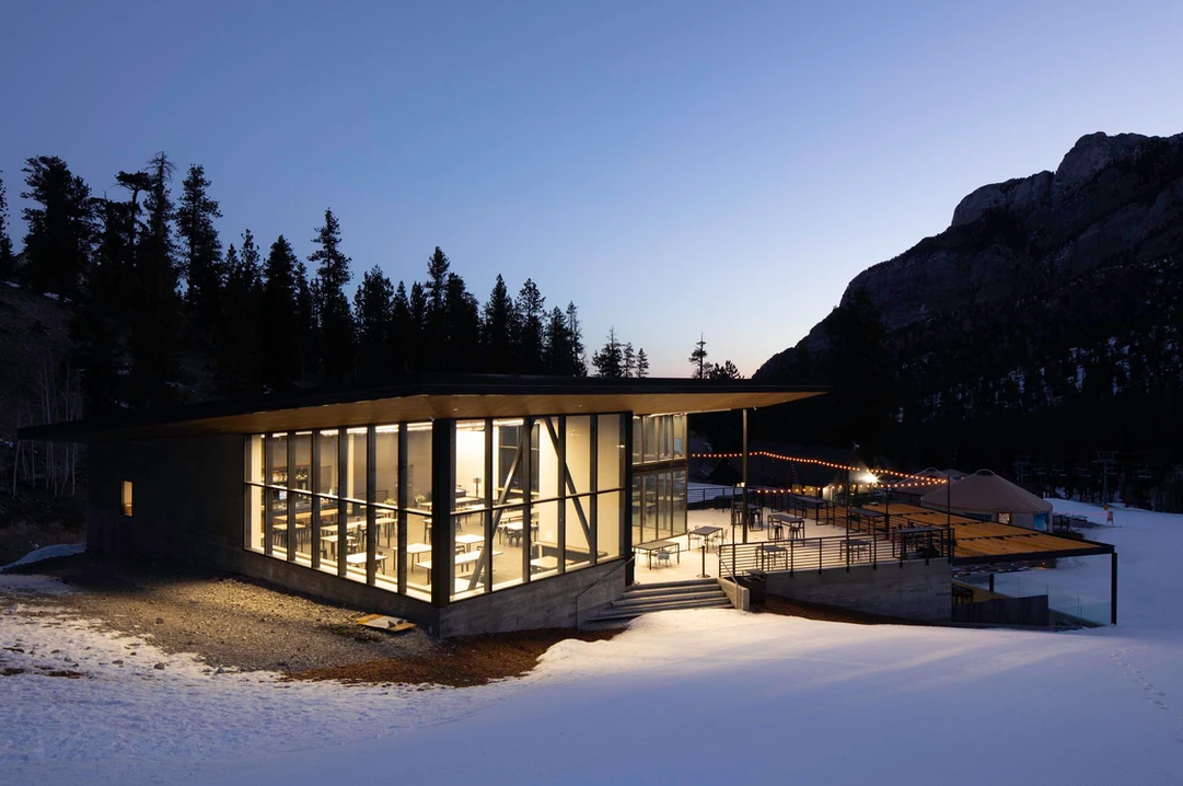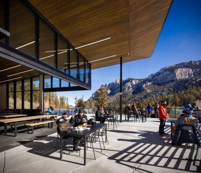 Lee Canyon, formally known as the Las Vegas Ski & Snowboard Resort, underwent its most significant transformation since opening in 1964 – with the intention of totally transforming the way guests enjoy the resort in both summer and winter. The new building is situated into the existing hillside, creating a defined courtyard area nestled between the new and existing buildings – while capitalizing on an important goal of the project to capture majestic surrounding views of the adjacent mountain ranges. The new building has been strategically sited at the bottom of the main ski slopes. This allows for the main bar area to be located at the second level (yet aligned with the higher mountain ski slope elevation), a perfect “ski-on” landing spot for the arrival of skiers on their way down the mountain. Additionally, this upper deck area and enclosed event space becomes the perfect backdrop for the resort’s popular wedding receptions and other larger special events. Improvements were developed to the existing building’s facades as well, aesthetically tying them into a complete complex.