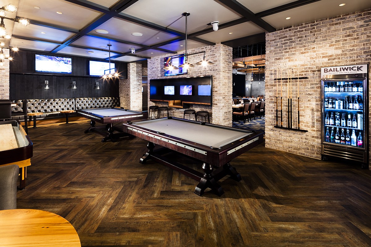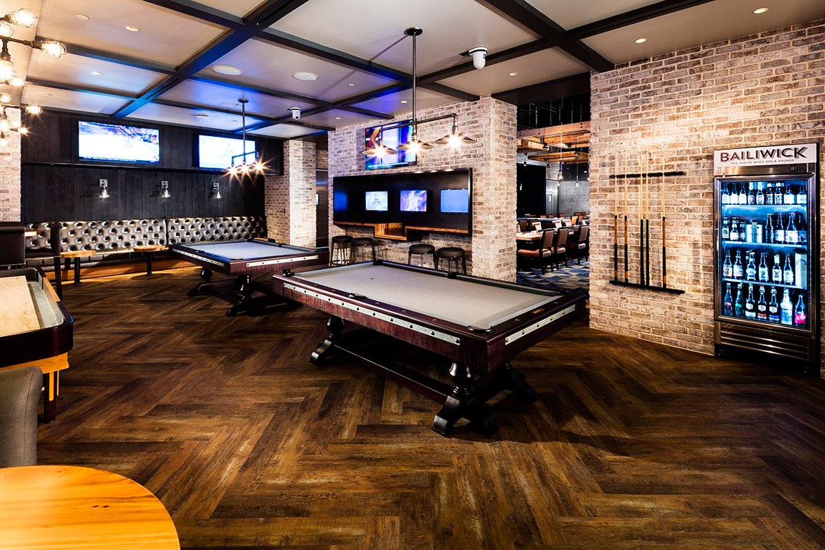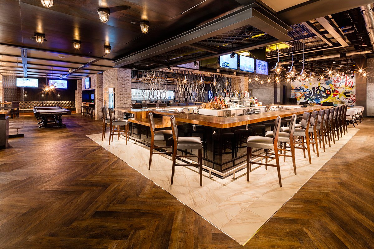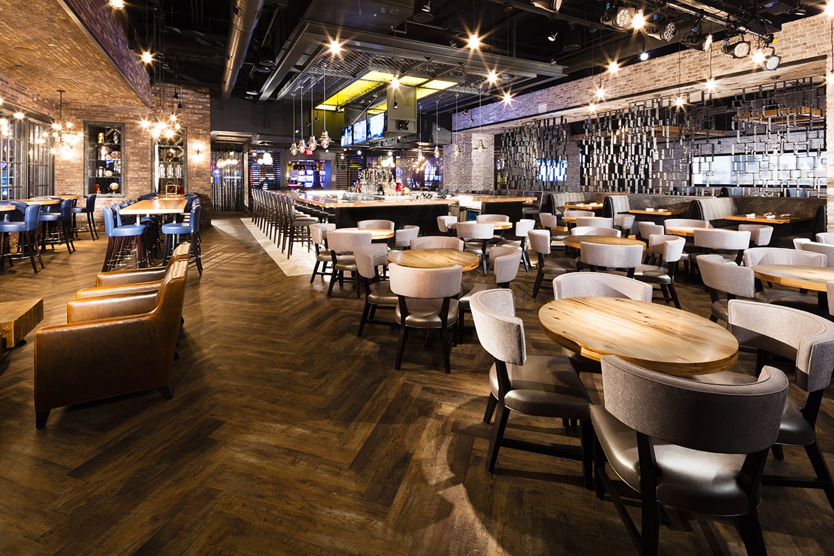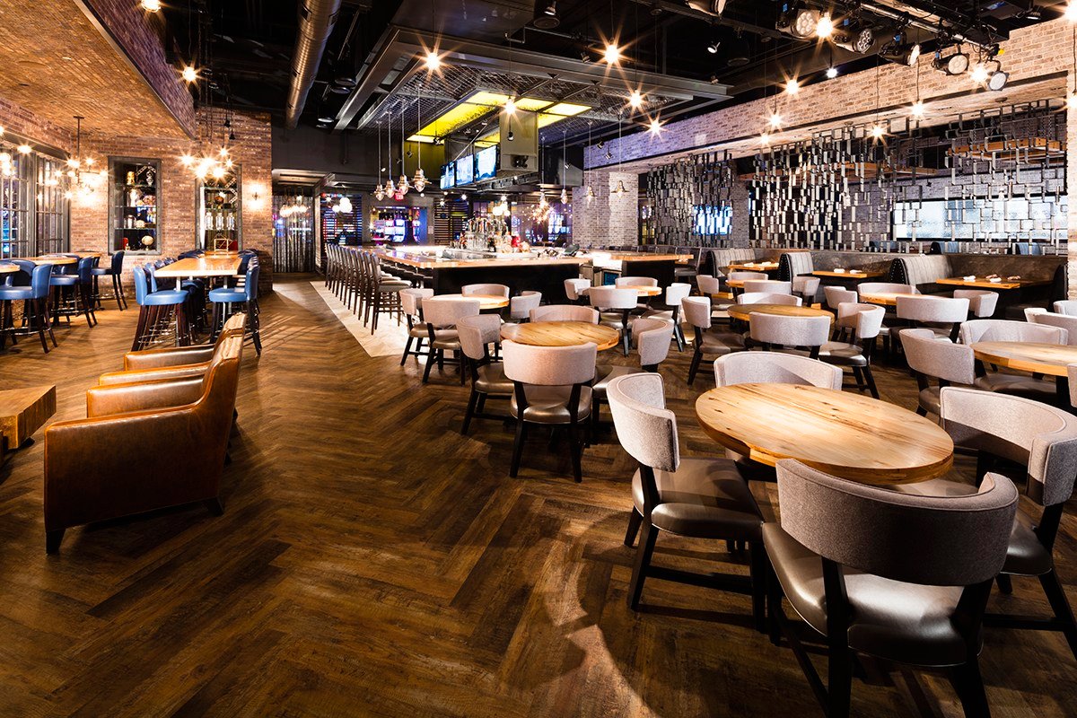 Gritty, Industrial, Chic. The design approach was to be tasteful and elegant while giving a nod to the gritty, industrial, and chic space the client wanted. A main feature bar is positioned just inside the entry and stage beyond. Tube steel sections were used in a decorative way to provide a screen wall separating the booths and a transparent barrier between the bar and dining room. The material pallet includes thin brick veneer, gigacrete (concrete) wall finish, industrial glazing sash, vinyl plank flooring, custom carpet, cold rolled steel and rusted steel panels, reclaimed hickory table tops, and porcelain tile.